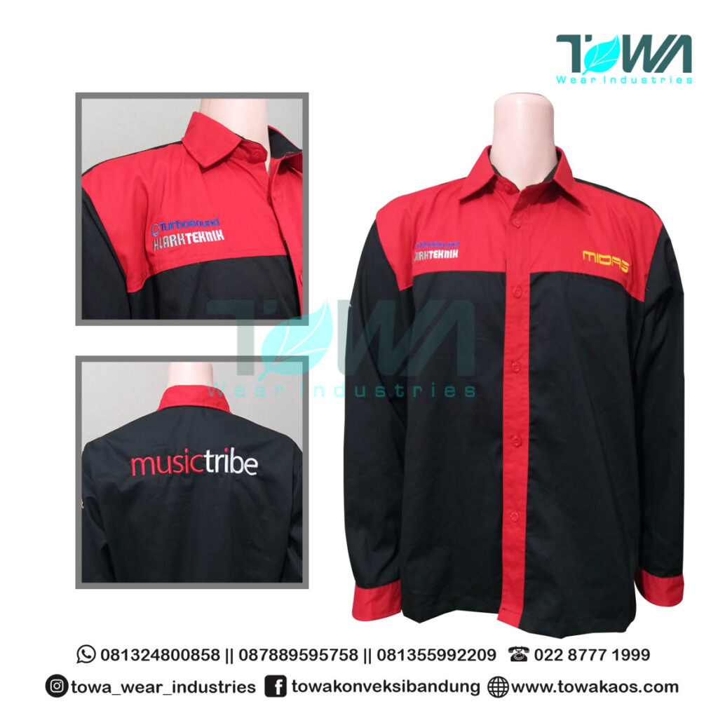 Baju Kemeja Seragam Lapangan / Kantor Music Tribe Lengan Panjang Bahan Japan Drill Kombinasi Warna Merah Hitam Bordir Logo