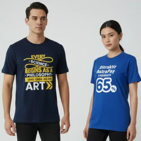 Produksi kaos custom berkualitas, sablon awet, bahan nyaman, cocok event, promosi, dan kebutuhan massal.